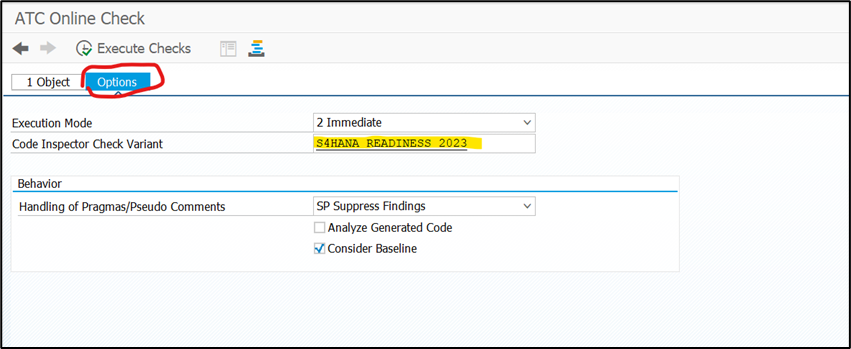 Go to Tab “Options”, select Code Inspector Check Variant “S4HANA_READINESS_2023”