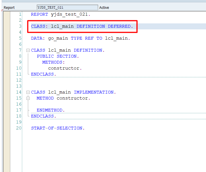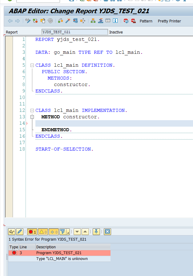 When you already declare class and the variable, but the error is still occurred (Type “lcl_main” is unknown) while you activated the program like the picture below, please add DEFINITION DEFFERED before the variable declaration.
